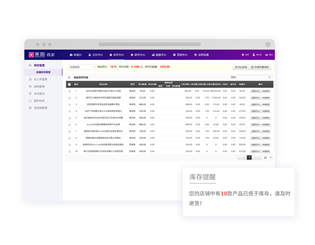 连锁调拨、月度盘点、供应商管理、客户寄存等,智能库存提醒,避免漏货、缺货的现象。