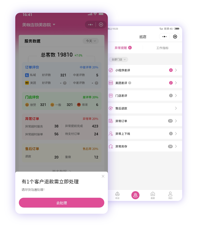 门店的服务差评、客户退款、技师上下线异常、库存缺货等异常情况都会通过实时通知预警。